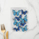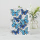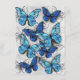 Composición vertical de mariposas morfo realistas, azules y blancas sobre fondo texturado gris. Mariposa morfo azul.