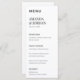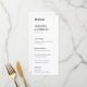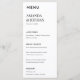 Eleva el ambiente de la mesa con este refinado y sobrio menú Minimalista Black & White Luxe. Este menú presenta una tipografía elegante y un diseño limpio, sin florituras, sin alboroto, sólo un estilo atemporal. Ya sea que esté organizando una cena formal, una recepción de cócteles o una celebración informal, esta tarjeta de menú ofrece una manera sofisticada de mostrar las ofertas de su evento.