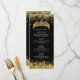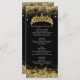 Un rico fondo negro muestra una tiara dorada brillante con confetti de oro falso lloviendo desde la parte superior de esta carta del menú para recogerla en la parte inferior. ¡Hace una carta de menú perfecta para la celebración más cegadora de Quinceanera! Esto también se puede personalizar para cualquier celebración de cumpleaños o de otra índole de un chica brillante. Disponible con productos a juego.