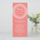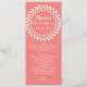 Menú largo y flaco de la tabla del boda hecho en color coralino elegante, con un círculo punteado blanco, en el top. Personalice todo el texto blanco para adaptarse a su menú de la recepción nupcial. Adición preciosa a su recepción nupcial.
