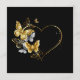 Marco dorado en forma de corazón, decorado con oro, joyas y mariposas blancas sobre fondo negro.