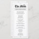 A stylish black and white Quinceañera menu designed with a modern, newspaper-inspired layout. Personalized with your event details, this interactive menu adds an elegant touch to each place setting while enhancing the overall table décor.