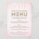 Esta encantadora tarjeta de menú diseñada por The Spotted Olive™ presenta un bonito fondo rosa suave con una imagen de gemas brillantes que fluyen desde la parte superior y la palabra "Menú" tipografiada con estilo con la palabra "Menú" llena de una imagen de brillo dorado. POR FAVOR, TENGAN EN CUENTA: ESTE DISEÑO SOLO PRESENTA UNA IMAGEN IMPRESA DE BRILLO; NO SE UTILIZA NI SE INCLUYE BRILLO FÍSICO; NO HAY EMBELLECIMIENTOS.