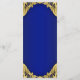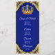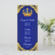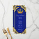 Menú de baby shower del príncipe con hermoso azul real y corona dorada sobre un elegante fondo de remolino azul real y dorado. Estos menús de baby shower del príncipe en azul real y dorado se personalizan fácilmente para su evento simplemente agregando sus detalles en el estilo de fuente y diseño que prefiera.