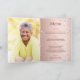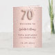 Un fondo degradado de falso oro rosa con diamantes rosados. El nombre está escrito con un estilo de letra a mano moderna de color oro rosa oscuro. El número 70 está escrito con una fuente de estilo globo, en cursiva. Texto de bienvenida, foto, menú y una nota de agradecimiento en la parte posterior.