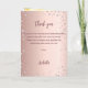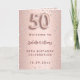 Un fondo degradado de falso oro rosa con diamantes rosados. El nombre está escrito con un estilo de letra a mano moderna de color oro rosa oscuro. El número 50 está escrito con una fuente de estilo globo aerostático y letra cursiva. Texto de bienvenida, foto, menú y nota de agradecimiento en el reverso.