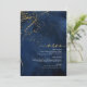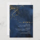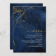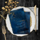 Un fondo de acuarela en tonos que van desde el azul marino hasta el azul real está coronado por un abstracto de líneas finas de oro y efectos de iluminación brillantes para crear las piezas de este hermoso conjunto de boda. La tarjeta del 'Menú' de la boda que se muestra aquí también presenta caligrafía elegante y una disposición descentrada para atractivo visual. Agregue fácilmente sus propias iniciales, fecha de boda y selecciones de menú utilizando la plantilla proporcionada. Busque ID867 para ver otras piezas y opciones de color para este conjunto.