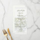 Plantilla de menú de boda alta, tamaño 4x9 pulgadas. Un texto gris verdoso muy oscuro está impreso sobre una imagen de fondo de estrella de mar y flor de hortensia. Los colores son ecru y blanco neutros. Utilice las plantillas de texto para incluir los nombres de pila de la pareja, la ubicación y la fecha del evento, el título del menú y un párrafo para enumerar los platos del menú. Utilice el espaciado para hacer que su lista quepa.
