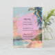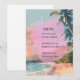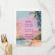 Este diseño de tarjeta de menú muestra una escena artística de playa tropical, con palmeras en silueta sobre un cielo vibrante y tonos pastel en el atardecer. Una forma rosa orgánica de bordes suaves se superpone en el centro del diseño, proporcionando un fondo moderno para el texto del menú. La estética general es elegante y ligera, perfectamente adecuada para una recepción de boda junto a la playa o con tema de verano, con los colores suaves y la imagen costera creando una atmósfera tranquila para los invitados.