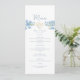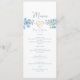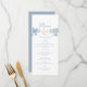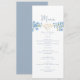 Elegante menú de boda en azul polvo con corazón de cuerda dorada, flores silvestres pervinca, monograma y letra caligráfica simple y moderna.