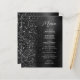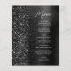Este menú de boda moderno y elegante presenta un borde de brillo de diamante falso sobre un fondo de metal cepillado negro falso. El texto personalizable combina una escritura a mano blanca con fuentes sans serif. El diseño de metal cepillado negro y brillo se repite en el reverso.