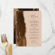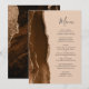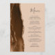 El borde izquierdo de este elegante menú de boda moderno presenta un borde de ágata de acuarela marrón café recortado con brillo dorado falso. El texto personalizable combina la escritura a mano caprichosa gris carbón y las fuentes copperplate sobre un fondo bronceado. La parte posterior presenta un diseño de ágata marrón y dorado a juego.