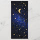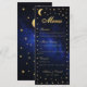 Este elegante menú de bodas celestial tiene un marco de estrellas de oro falso y luna sobre un fondo azul oscuro que representa el cielo nocturno. Los nombres, el título "Menú" y los subtítulos están escritos en una elegante letra caligráfica. Todo el texto se puede personalizar y tiene un color dorado similar al de las estrellas.