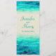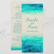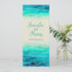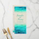 Menú de boda con superposición de brillo de olas gráficas y mar pintado en azul y verde. Una hermosa playa, inspirada en el océano costero, una invitación de boda contemporánea que presenta un mar estilizado y único, pintado a mano con acuarela, sobre un papel de color arena. Perfecto para una boda de playa moderna. Edite esta invitación con sus propias palabras. Diseñado y pintado de manera única por Sarah Trett.