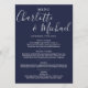 Tarjeta de menú de boda azul marino elegante con nombres de estilo de firma, este menú moderno se puede personalizar con los detalles de su boda en letra blanca chic. Diseñado por Thisisnotme©