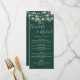 Tarjeta de menú de boda elegante verde esmeralda con hermosas luces de cuerda y nombres de estilo con firma. Esta tarjeta de menú moderna se puede personalizar con su información en letra blanca chic. Diseñado por Thisisnotme©