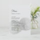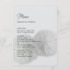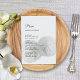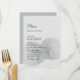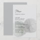 Plantilla de menú de boda moderna con dólares de arena. Tonos grises neutros y texto negro. El texto se alinea al lado izquierdo con el título 'Menú' y los nombres de los novios. Todas las selecciones del menú se agregan en un párrafo. Dos grandes imágenes de dólares de arena blancos son el fondo. La parte posterior es de un color gris más oscuro.