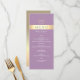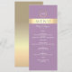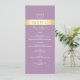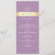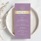 Menú de boda moderno y elegante con púrpura lavanda y papel de oro con escritura moderna simple y monograma en la parte superior.