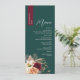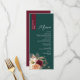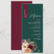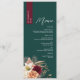Agregue una rica elegancia de otoño a la decoración de sus mesas de boda con este menú de boda personalizado de tonos joya. Con un fondo de esmeralda verde profundo y una franja de nombre de color burdeos dramático, este diseño floral rústico muestra románticas flores de color rosa, marfil y vino con hierbas secas, perfecto para celebraciones de otoño o invierno. Las fuentes elegantes y la disposición limpia le dan un toque atemporal y moderno. Personalice los detalles de la comida y el nombre del invitado para tener una hermosa alternativa de tarjeta de lugar en su recepción.