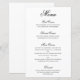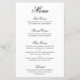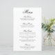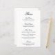 Menú de boda de estilo elegante y clásico que presenta un diseño simple con "menú" y los encabezados de los platos en caligrafía negra formal y descripciones de los platos en una tipografía serif sobre un fondo blanco. Un diseño tradicional y elegante perfecto para una boda de etiqueta. Estos menús de boda económicos se imprimen en hojas de papel para una opción económica.