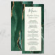 Este elegante menú de boda moderno cuenta con un marco de ágata acuarela verde esmeralda. El texto personalizable combina la escritura a mano caprichosa verde con fuentes en itálica y copperplate sobre un fondo de marfil. El reverso presenta un diseño de ágata verde esmeralda y dorado a juego.