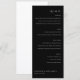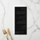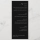 Este elegante menú de boda presenta un fondo negro elegante con texto blanco crujiente, creando una apariencia sofisticada y moderna. El diseño está organizado en secciones distintas para Entrantes, Ensalada, Plato Principal y Postre, cada una resaltada en fuente sans-serif mayúscula limpia. Un toque de elegancia se añade mediante la escritura cursiva utilizada para la palabra "MENÚ" en la parte superior. Perfecto para eventos formales, este diseño emana un ambiente refinado, lo que lo hace ideal para bodas o reuniones de lujo.