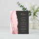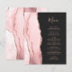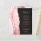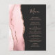 El borde izquierdo de esta elegante invitación de boda moderna presenta un borde de ágata de acuarela rosa rubor recortado con brillo dorado rosa falso. El texto personalizable combina la escritura a mano rosa y las fuentes copperplate sobre un fondo negro apagado. La parte posterior presenta un diseño de ágata rosa rubor y dorado rosa a juego.