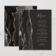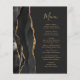 El borde izquierdo de este elegante menú de boda moderno presenta un borde de ágata de acuarela negra recortado con brillo de oro falso. El texto personalizable combina la escritura a mano de color dorado y las fuentes copperplate sobre un fondo negro apagado. La parte posterior presenta un diseño de ágata negro y dorado a juego.