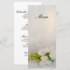 El menú de bodas de primavera con el tulipán blanco bonito se puede personalizar con los detalles de la comida que se sirven en la elegante cena de boda de marzo, abril o mayo, después del brunch boda o del almuerzo de fiesta de jardín con ducha de novia. Este elegante menú personalizado florido presenta una fotografía floral de un ramo de flores de tulipán blanco y un collar de perlas blancas con fondo de satén blanco.