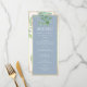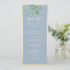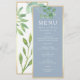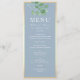 Menú de boda simple, elegante, botánico en azul polvoriento con vegetación de eucalipto en acuarela y letra caligráfica moderna.