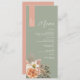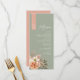 Añada un suave encanto rústico a su recepción con este menú boda verde sabio personalizado con el nombre de cada cliente en una franja vertical de acento melocotón. Elegantes fuentes de escritura y un relajante paro de fondo verde maravillosamente con los románticos florales de color rubor, melocotón y marfil en la parte inferior, complementados con follaje seco para un sutil toque de caída. Ideal para los bodas boho, rústicos o del campo, esta carta se presenta como una elegante carta de lugar. Personalizar fácilmente el nombre del cliente y los cursos de cena para su día especial.