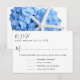 Tarjetas de respuesta de menú de jardín junto al mar. Incluya con las invitaciones de boda y pida a los invitados que elijan un plato principal de la lista del menú. También incluya texto para aquellos que no asistirán. Plantillas de papel blanco con texto negro. El diseño floral azul está en la parte posterior. Una estrella de mar blanca está colocada entre las flores y le da a este RSVP un tema de verano o playa.