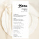 Este moderno menú de boda con letras retro es perfecto para su boda bohemio de verano, único y moderno. La letra es un elegante tipo de letra negro de moda 70, que da a este diseño un diseño clásico minimalista de vibraciones hippie. Puede agregar sus propios gráficos o imágenes si desea personalizares. Por favor siéntase libre de contactar con cualquier pregunta sobre el diseño del producto; estamos encantados de ayudar!