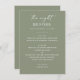 Con este sabroso menú de la cena verde le daremos un tono sereno a "La noche anterior". Los colores suaves y terrenales y el diseño minimalista limpio lo convierten en un lugar ideal para los temas del jardín, los bosques o los bodas de boho, especialmente en primavera, verano o comienzos del otoño. Diseñado con estilo y sentido práctico en mente, este menú editable es perfecto para parejas y planificadores de bodas que desean un aspecto refinado y cohesivo. Personalice sus cursos de cena y los detalles del evento para que se adapten a su celebración.