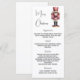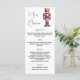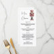 Tarjeta de menú de cena de la fiesta de Navidad. Personalizable con nombre/evento, fecha y menú. Fondo blanco, texto negro. Decorado con un cascanueces polvoriento rosa. Texto: Feliz Navidad