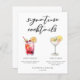 En esta hoja de papel de menú de cócteles de la moda destacan la tipografía negra personalizado sobre 2 bebidas y sus ingredientes para su bar boda. Un bonito templo sucio de Shirley y un dibujo de martini de Lemon Drop le dan un toque fresco a su menú de bar. Con los nombres de la pareja y la fecha de recepción.