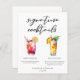 Esta hoja de menú de cócteles con la firma de la moda incluye tipografía negra personalizado por encima de 2 bebidas y sus ingredientes para su bar boda. Un bonito templo sucio de Shirley y un dibujo de Piña Colada le dan un toque fresco a su menú del bar. Con los nombres de la pareja y la fecha de recepción.