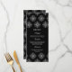 Elegante menú boda de moda con un elegante fondo negro y un diseño blanco de damasco con copas de nieve en la parte superior e inferior. En el centro, se puede personalizar fácilmente con el menú.