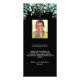 Carta de menú de la fiesta de cumpleaños. Personalice y agregue un nombre, edad, fecha y el menú. Un fondo negro adornado con vegetación eucaliptus y helechos de bosque. Letras de color blanco. Atrás: agrega una foto del chica de cumpleaños, datos divertidos y nombres.