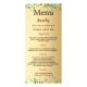 Carta de menú de la fiesta de cumpleaños. Personalice y agregue un nombre, edad, fecha y el menú. Un falso fondo dorado. Decorada con confetti verde, texto negro. Atrás: agrega una foto del chica de cumpleaños, datos divertidos y nombres.