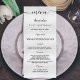 Carta de menú de la fiesta de cumpleaños. Personalice y agregue un nombre, edad, fecha y el menú. Fondo plateado de aspecto metálico. Letras de color negro.