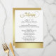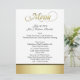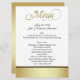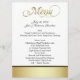Menús elegantes de la tabla de la recepción nupcial hechos en blanco, con una banda del oro y del negro, en la cubierta delantera y dorada inferior la parte posterior del menú. El menú en texto gráfico de lujo dorado de la escritura, adorna el top del menú. Todo el resto del texto negro está listo para personalizar para su recepción nupcial. Productos a juego del boda disponibles.