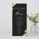 Menú abstracto de negro y dorado. Hoja de oro falsa. Fuente de letra destaca con fuente de nombre serif fácil de leer. Fácil de ajustar para las necesidades de su boda. Cree su propio menú, use su propio texto para crear un menú de evento elegante pero barato y asequible. Fácil de personalizar. Hojas de papel de menú personalizadas.