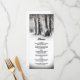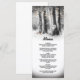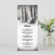 Tarjetas de menú de cena de Navidad de invierno rústico con un ambiente de boda de bosque nevado al aire libre, cálidas luces de cadena brillantes, un corazón tallado romántico en el tronco de un árbol con tus iniciales, dos petirrojos de invierno y una plantilla de menú personalizada.