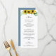 Menú con un diseño floral moderno y romántico con girasoles de acuarela amarillos y un dorso azul rosado con un frente blanco.
