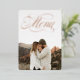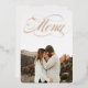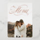 Hermoso y elegante menú que presenta una foto favorita y un titular de "menú" realzado con hoja de oro en la parte frontal. Su elección entre oro, plata o rosa. Utilice el dorso para diseñar su menú de boda (sin hoja de oro en el dorso).