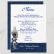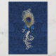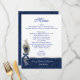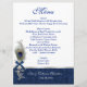 Elegante menú de bodas en blanco, con un damasco azul sobre azul y una banda de tonos plateados en el fondo. Los gráficos de un tono plateado florecen con el arco azul, la pluma de pavo real y las perlas, decoran la parte inferior izquierda del menú, con una versión más grande, en el fondo del menú. Personalice el texto azul y gris claro con su información. Adicional a nuestro conjunto de bodas Blue Damask y Peacock Feather.