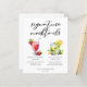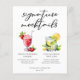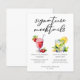 Esta hoja de menú de mocktails de firma de boda presenta una escritura simple encima de dos bebidas y sus ingredientes para su recepción. Una linda bebida Virgen Daiquiri de Fresa y un dibujo de Menta Julep sin alcohol encima de los nombres de la pareja y la fecha.