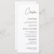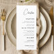 Menú blanco minimalista con un nombre de invitado de guion personalizado, diseñado para servir como tarjeta de lugar y guía de comedor. Perfecto para bodas, cenas de ensayo, duchas de novias o fiestas de compromiso, esta versátil tarjeta combina personalización con elegancia moderna. La disposición en blanco y negro y la tipografía de moda crean un detalle atemporal y elegante que mejora la configuración de las mesas para cualquier celebración sofisticada.