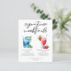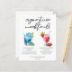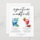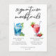 Este menú de moda de , característico de las parrilladas, presenta una sencilla tipografía negra sobre 2 bebidas junto al mar y sus ingredientes para su fiesta costero. Una bebida refrescante Blue Hawaiian sunrise y un dibujo no alcohólico de Strawberry Daiquiri añaden un toque fresco a su carta de bar. Con los nombres de la pareja y la fecha de recepción.
